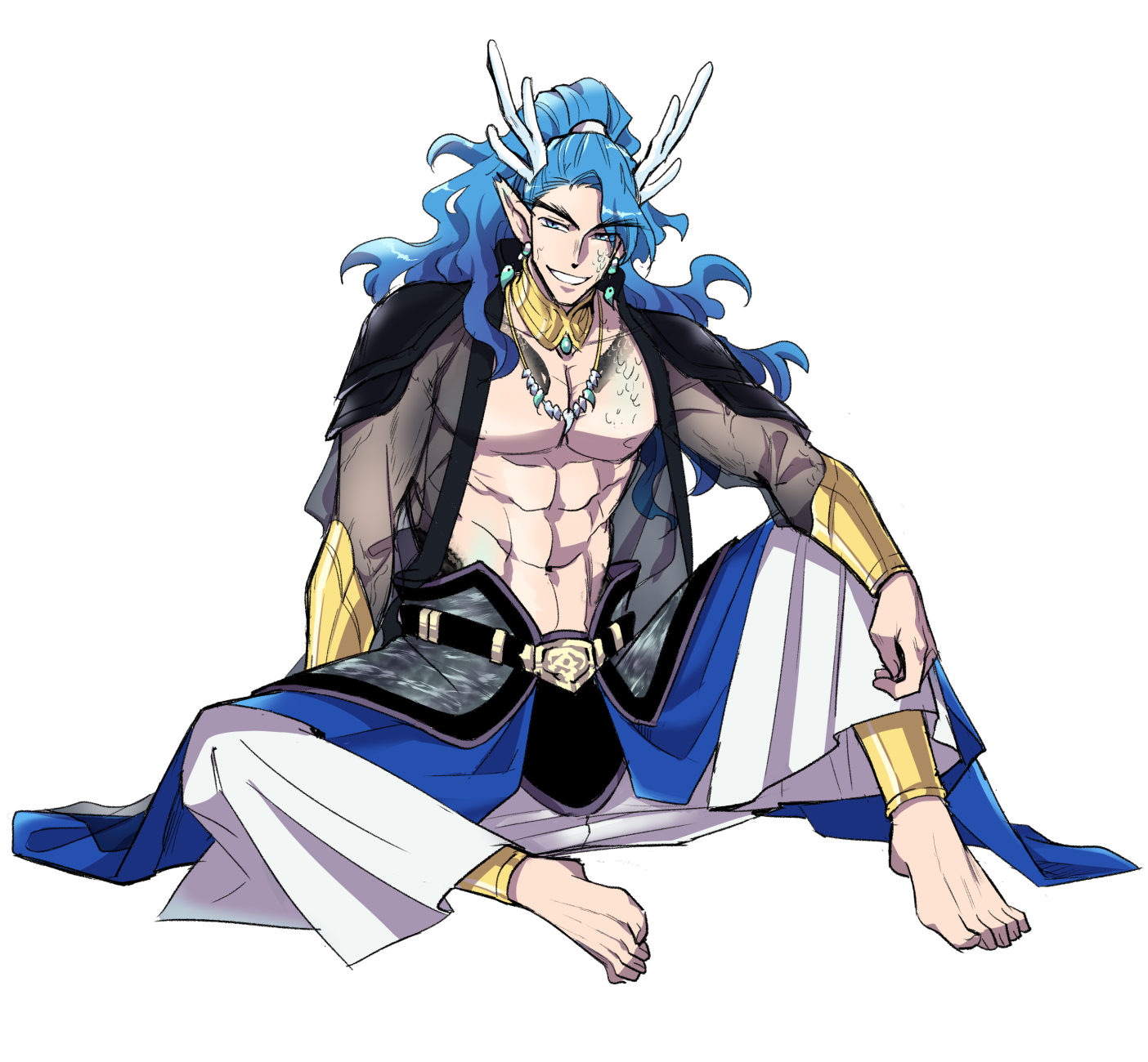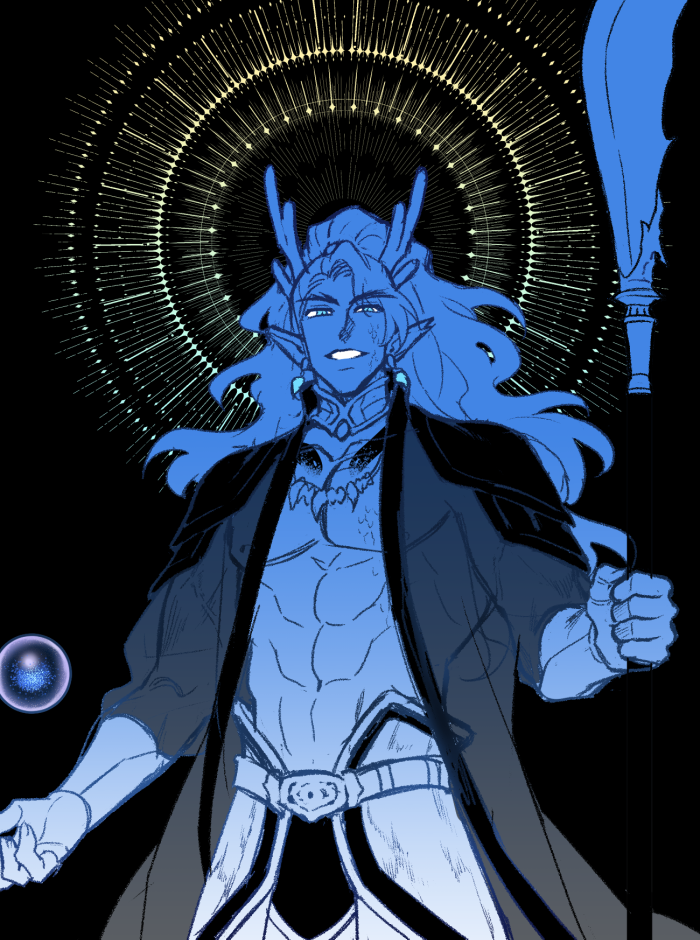 파도색깔의 굵게 굽이치는 장발에 하늘빛 눈, 눈썹에 길고 굵다. 푸른 백색의 뿔이 달려있으며 몸 군데군데 비늘이 돋아있음.
